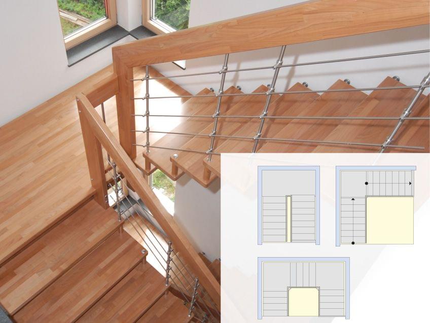 Eine Besonderheit: Bei rechtwinkligen abgewinkelten Podesttreppen sollte darauf geachtet werden, dass das Zwischenpodest nicht quadratisch, sondern rechteckig oder abgewinkelt ausgeführt wird. Nur so erreicht man einen harmonischen Geländerverlauf, sonst entstehen unterschiedliche Geländerhöhen oder der Handlauf verspringt im Knickbereich um eine Steigungshöhe.