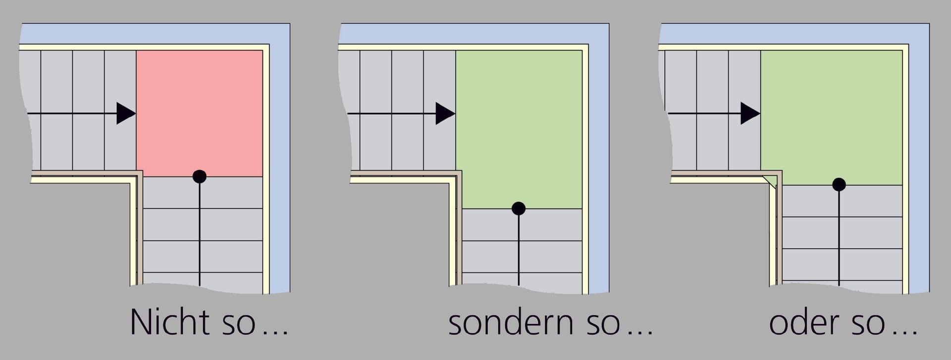 • Sofern ein Höhenversatz des Geländers in der Podestecke vermieden werden soll, empfiehlt sich die Planung des Podestes wie unten gezeigt